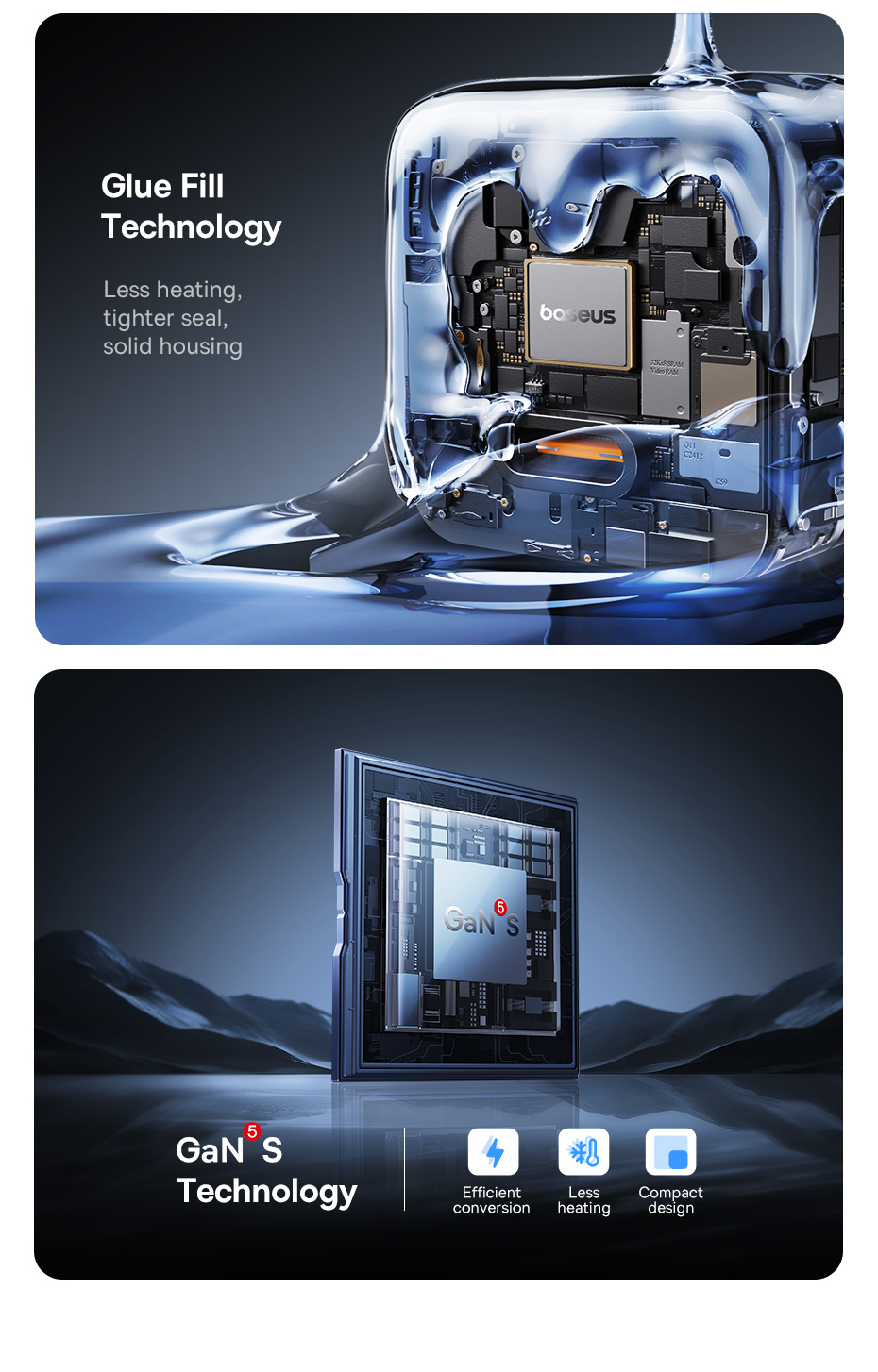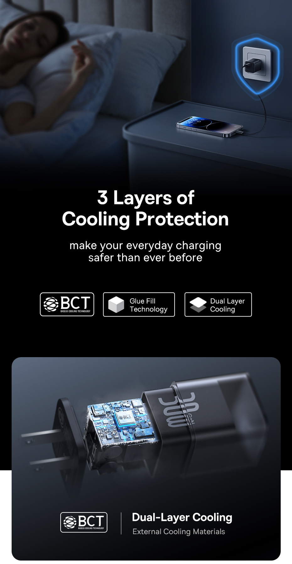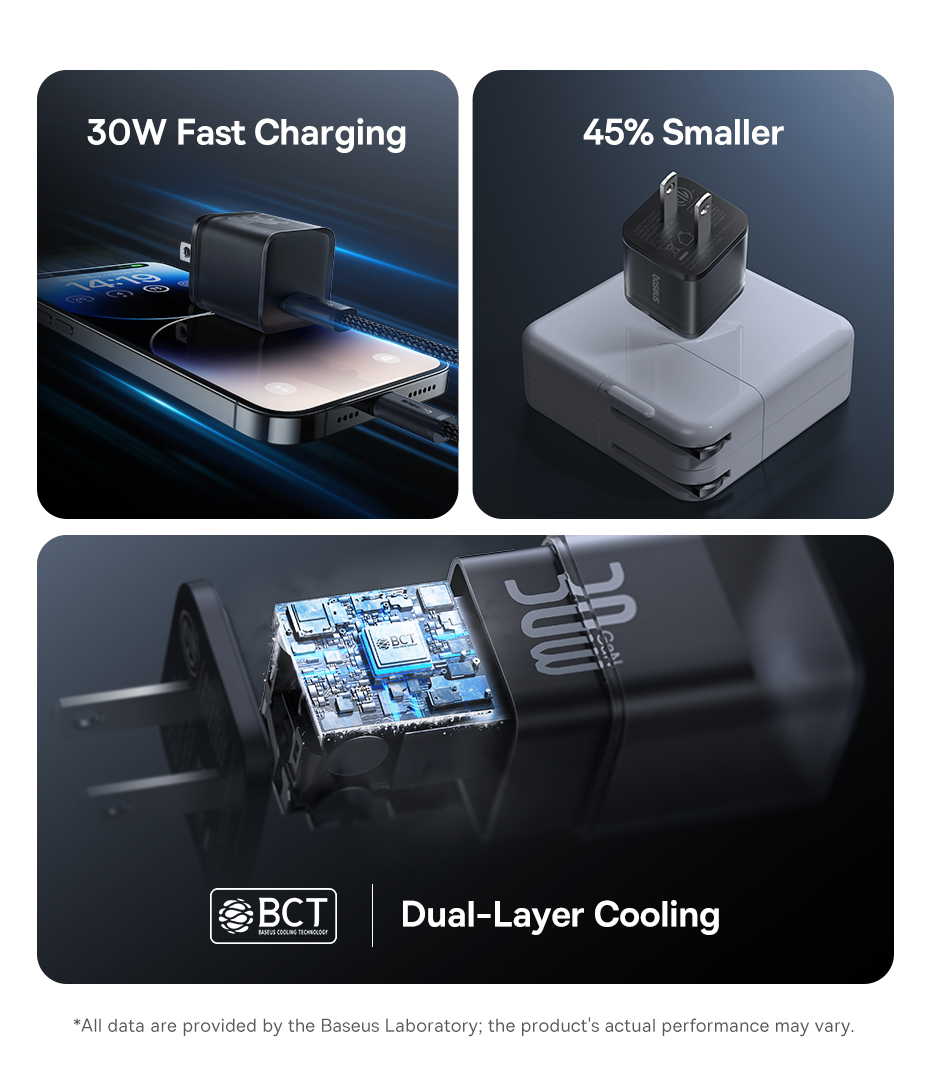 ❄️ LÀM MÁT 2 LỚP - SẠC AN TOÀN SUỐT ĐÊM: Hệ thống làm mát kép tiên tiến kết hợp công nghệ BCT (Baseus Cooling Technology) và keo tản nhiệt (Glue Fill Tech), giúp củ sạc luôn duy trì nhiệt độ thấp ngay cả khi sạc nhanh, bảo vệ pin và thiết bị an toàn tuyệt đối.