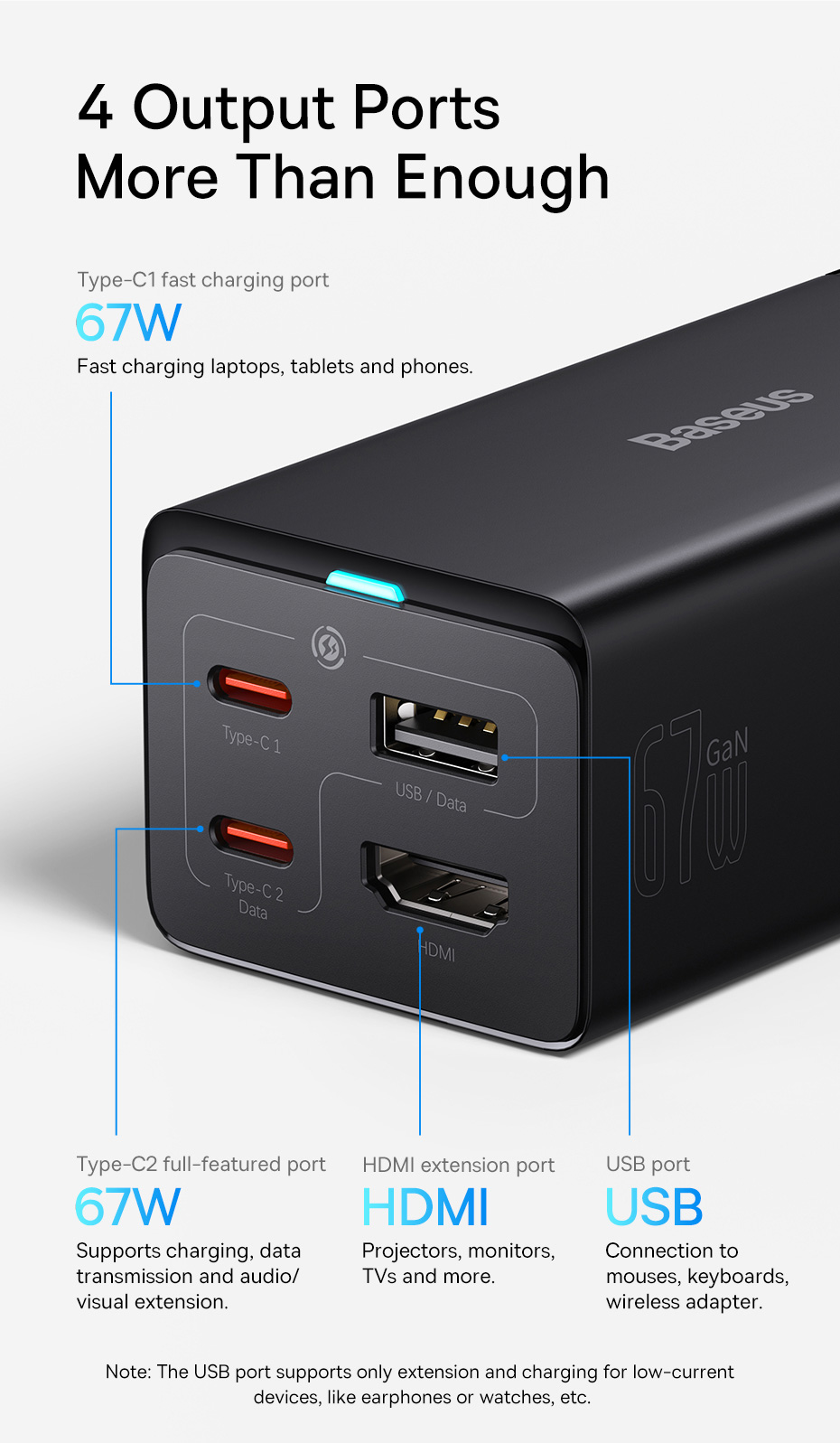 Bạn mệt mỏi vì củ sạc chỉ để sạc và Hub chỉ để chia cổng? Baseus GaN5 Pro 67W là giải pháp 2-trong-1 đột phá, kết hợp Củ Sạc Nhanh GaN5 67W và Hub Mở Rộng 4K HDMI. Chỉ một thiết bị duy nhất cho cả sạc laptop, xuất màn hình và truyền dữ liệu.