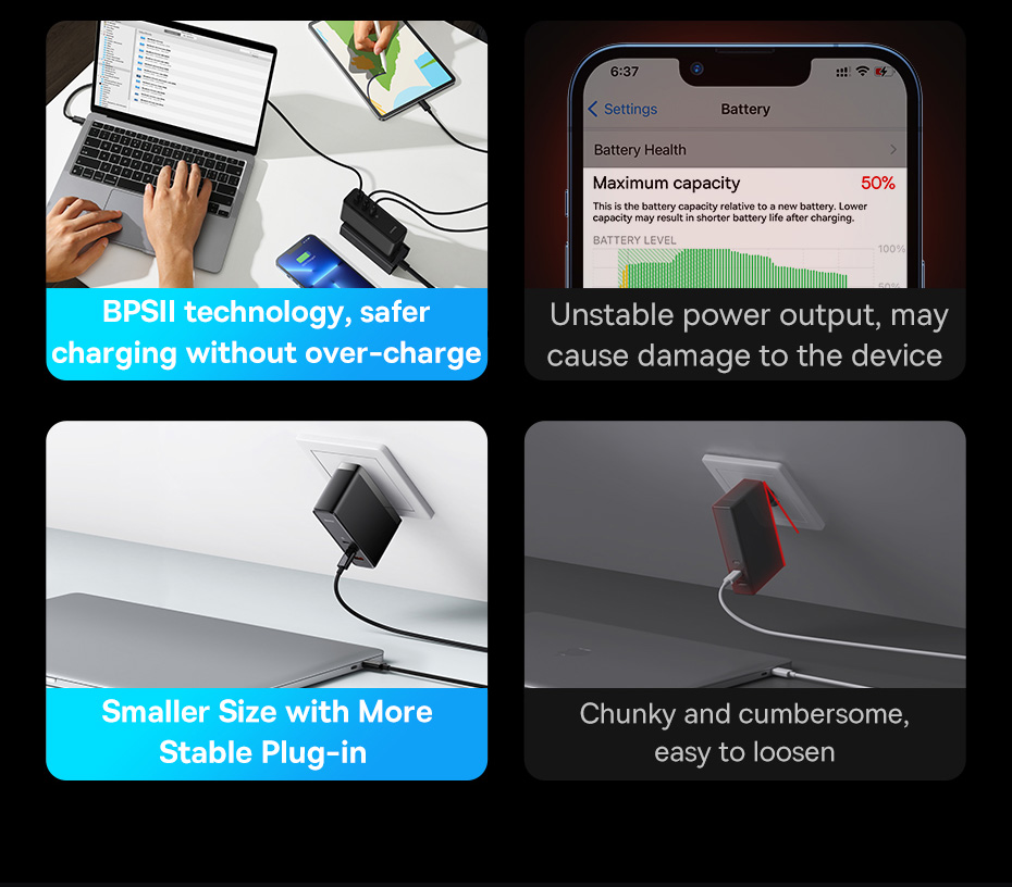 Công nghệ BPS 2 cung cấp khả năng phân chia điện hợp lý và thông minh trong quá trình sạc giúp sạc nhanh đồng thời 3 cổng và bảo vệ pin