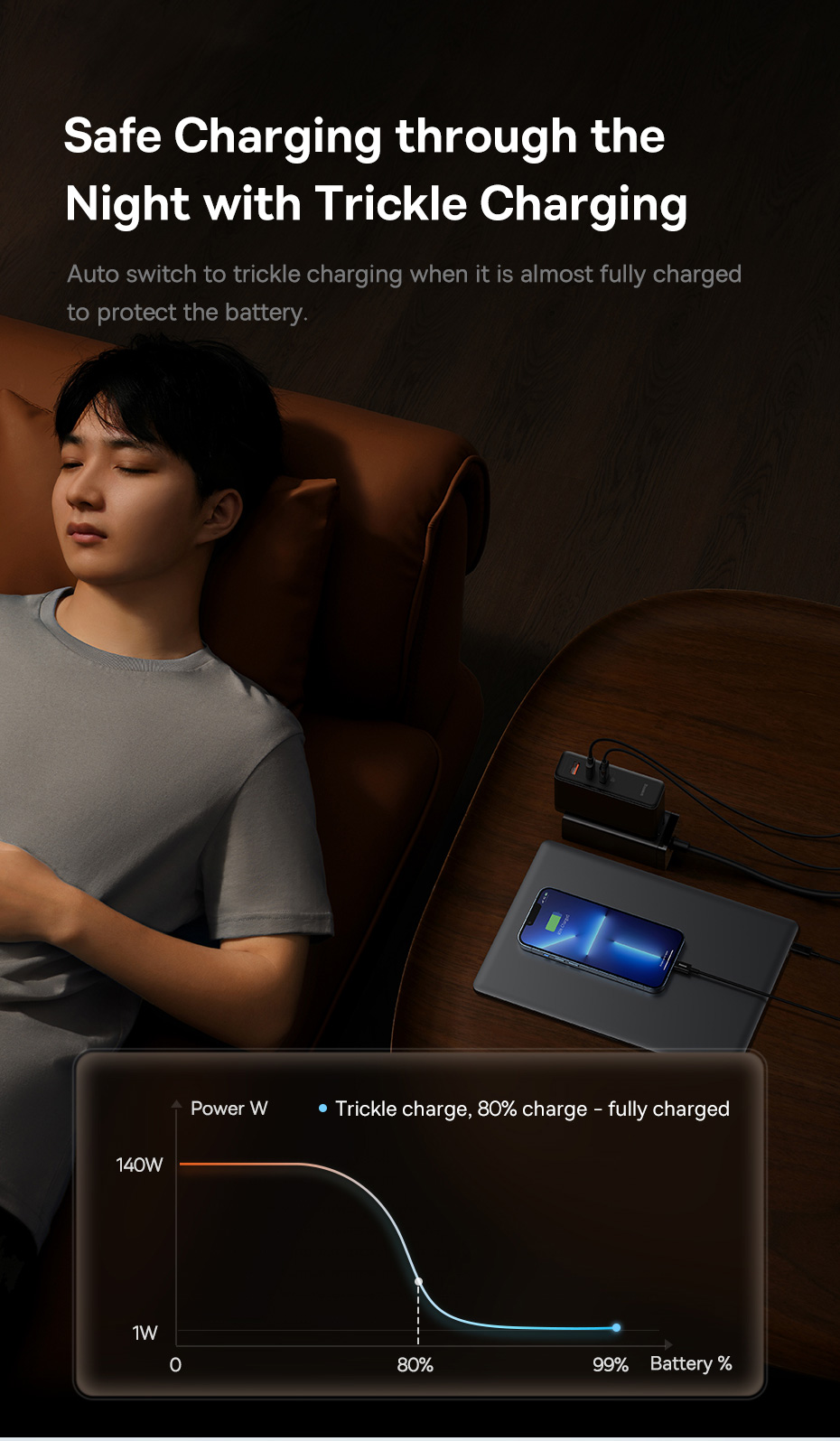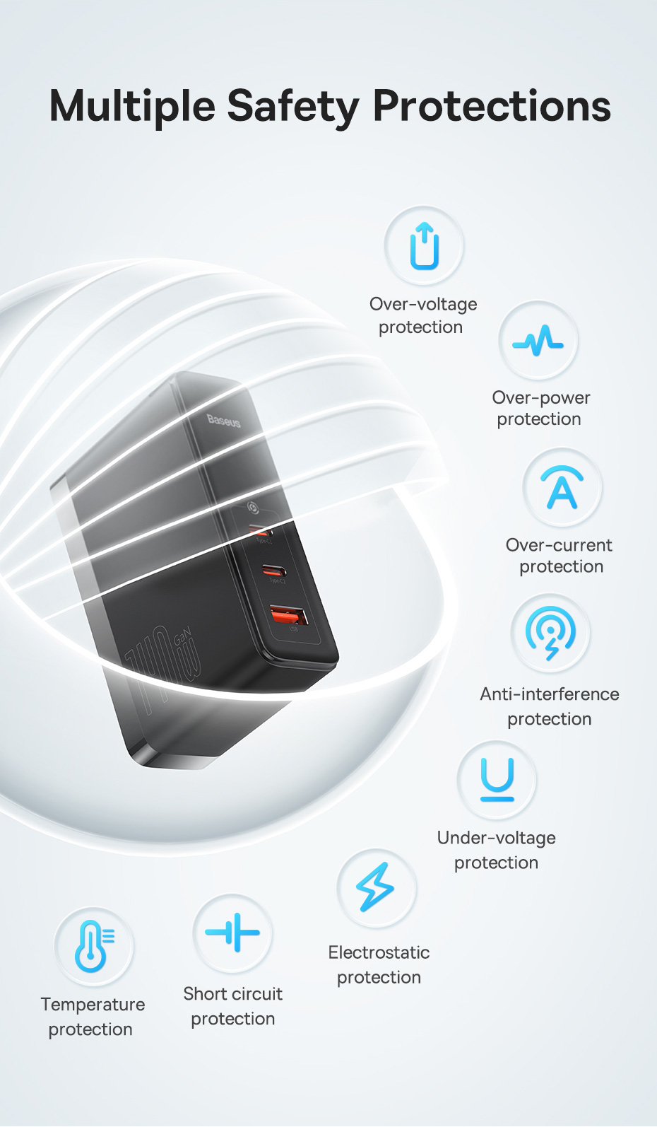 Baseus GaN5 Pro được tích hợp nhiều tính năng bảo vệ đạt chuẩn Thế Giới : bảo vệ quá dòng, ngắn mạch, quá nhiệt, chống nhiễu, chống nổ, tự điều chỉnh sạc nhỏ giọt khi pin 80% giúp thiết bị không bị chai pin, sạc qua đêm thoải mái mà không cần phải canh thời gian sạc đầy.