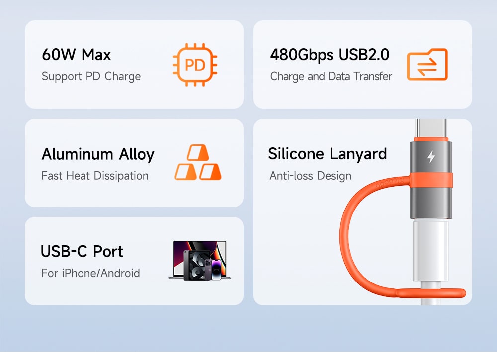 👌 THIẾT KẾ THÔNG MINH, CHỐNG THẤT LẠC: Với vỏ hợp kim nhôm cao cấp và kích thước siêu nhỏ, đầu chuyển mang lại vẻ ngoài sang trọng. Đặc biệt, sản phẩm đi kèm một móc silicon dẻo dai, giúp bạn gắn chặt đầu chuyển vào thân cáp sạc, không bao giờ lo bị rơi hay thất lạc.