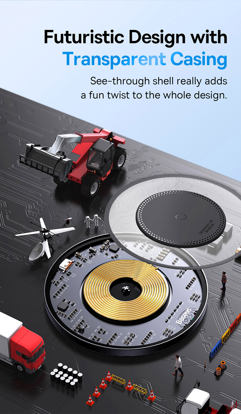 ✨ THIẾT KẾ TRONG SUỐT ĐỘC ĐÁO: Phá vỡ thiết kế truyền thống với lớp vỏ trong suốt để lộ các linh kiện và cuộn sạc bên trong. Một tuyệt tác công nghệ vừa sạc hiệu quả, vừa là điểm nhấn phong cách cho không gian của bạn.
