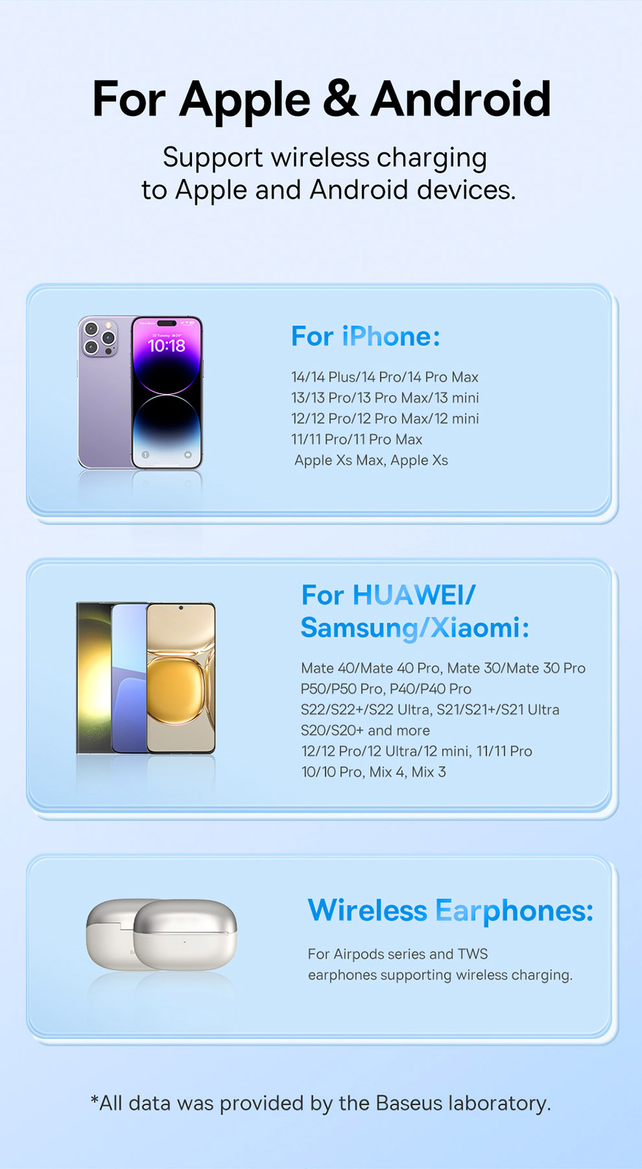 Tương Thích Rộng: Sạc cho tất cả điện thoại và tai nghe có hỗ trợ sạc không dây Qi.