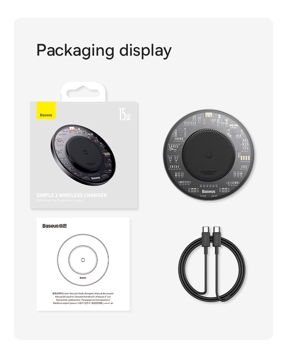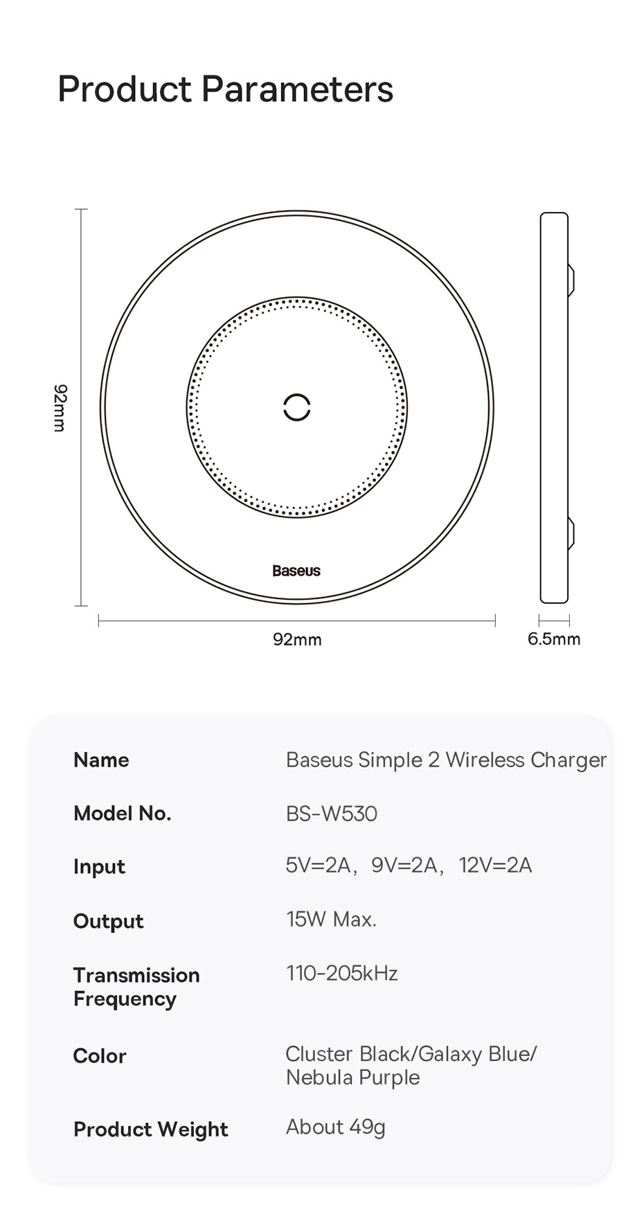 | Tên | Đế Sạc Không Dây Baseus Simple 2 Wireless Charger 15W (Kèm cáp C to C 24W 1m) |
