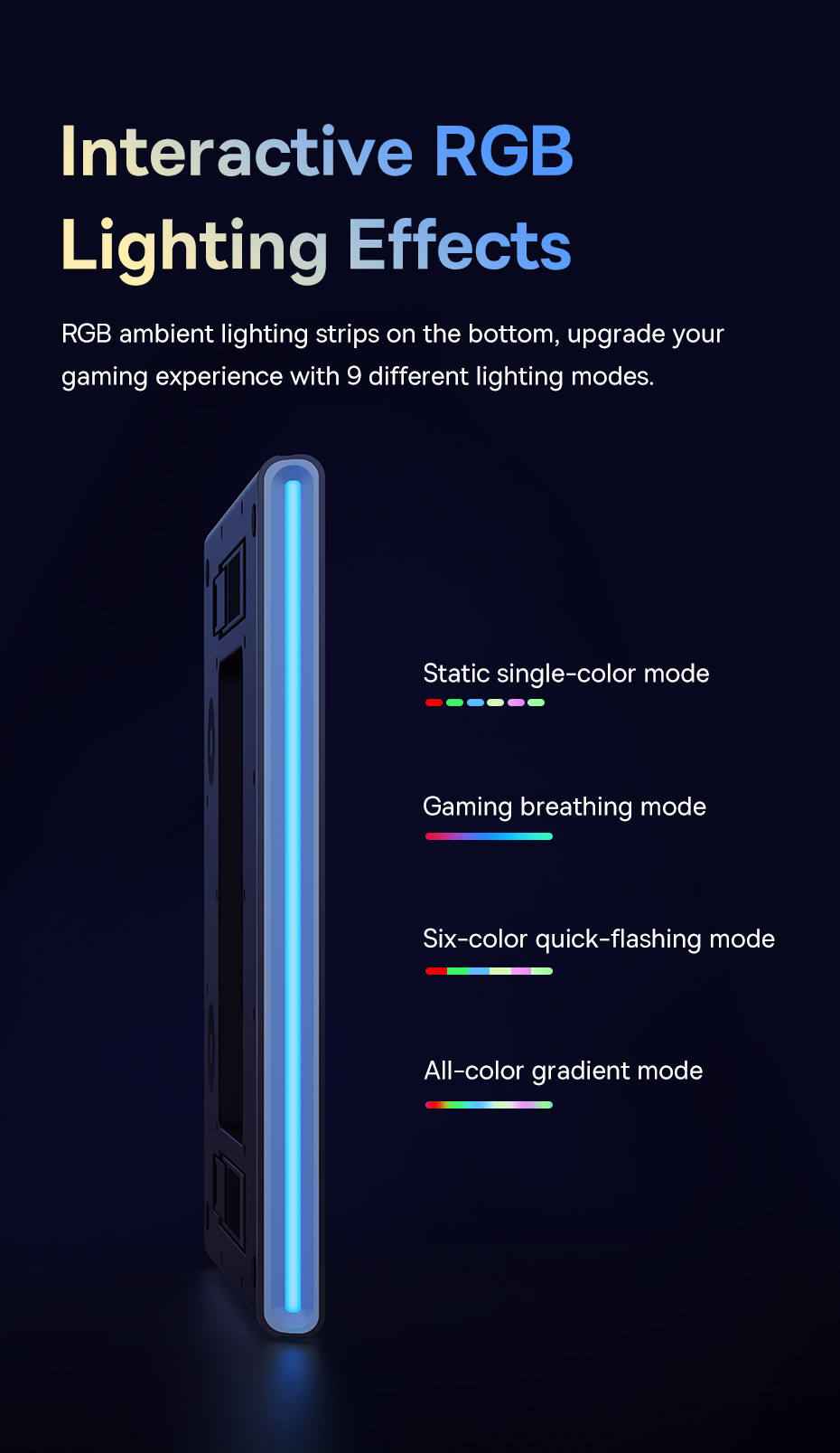 🎮 ĐÈN LED RGB 9 CHẾ ĐỘ - ĐẬM CHẤT GAMING: Nâng cấp góc gaming của bạn với dải đèn LED RGB sống động hai bên cạnh đế. Dễ dàng chuyển đổi giữa 9 hiệu ứng ánh sáng khác nhau (đơn sắc, đổi màu, hơi thở...) để tạo không khí hứng khởi.