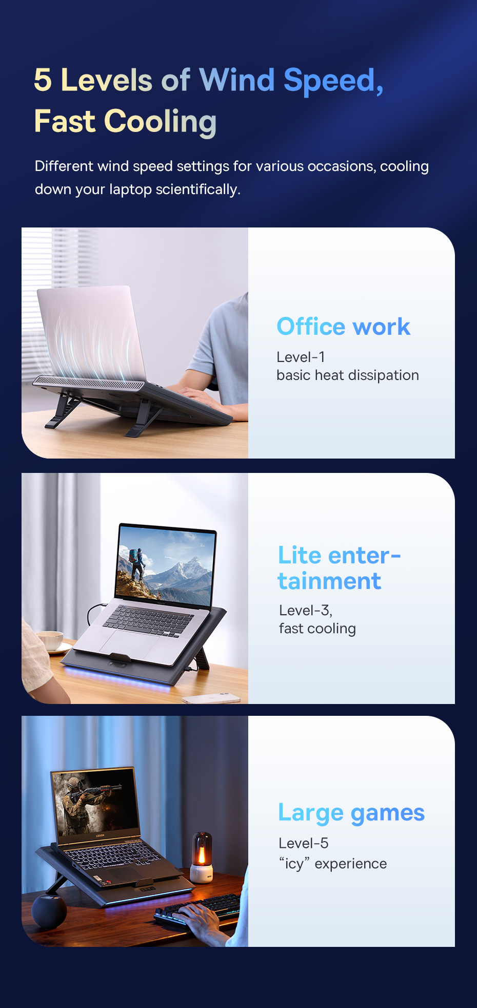 🔇 HOẠT ĐỘNG SIÊU ÊM ÁI: Dù sở hữu quạt tốc độ cao, đế tản nhiệt Baseus ThermoCool vẫn hoạt động cực kỳ êm ái, gần như không gây ra tiếng ồn khó chịu, giúp bạn tập trung tối đa vào công việc hay trận đấu.