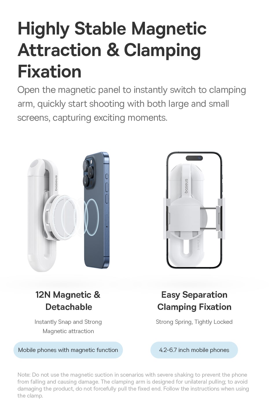 ○ Hỗ trợ giữ điện thoại bằng cả hít nam châm và ngàm kẹp.