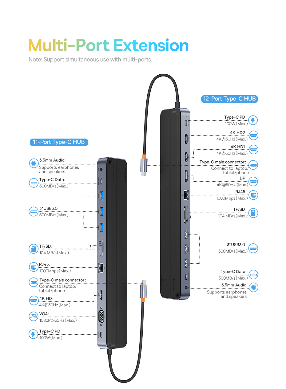 Bản 11 trong 1: Gồm các cổng: HDMI 4K@30Hz, VGA, Type-C PD, Type-C Data, 3xUSB 3.0, LAN, SD/TF, Audio 3.5mm.