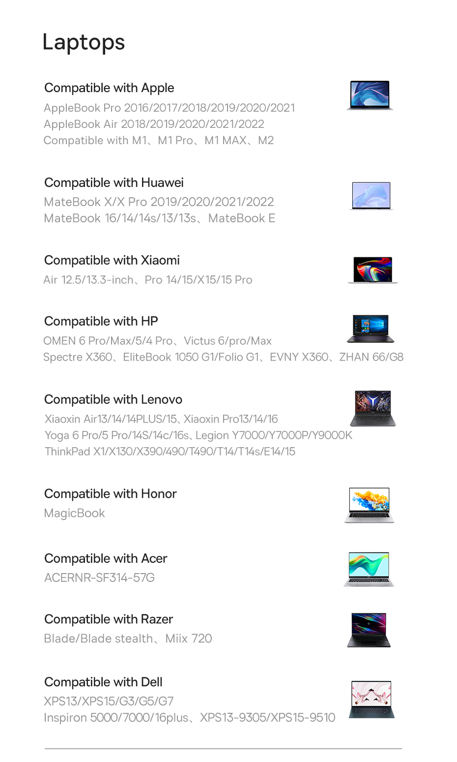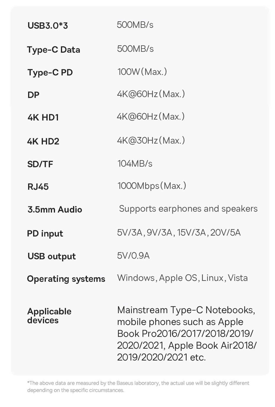 | PD Input | 5V/3A, 9V/3A. 15V/3A. 20V/5A |