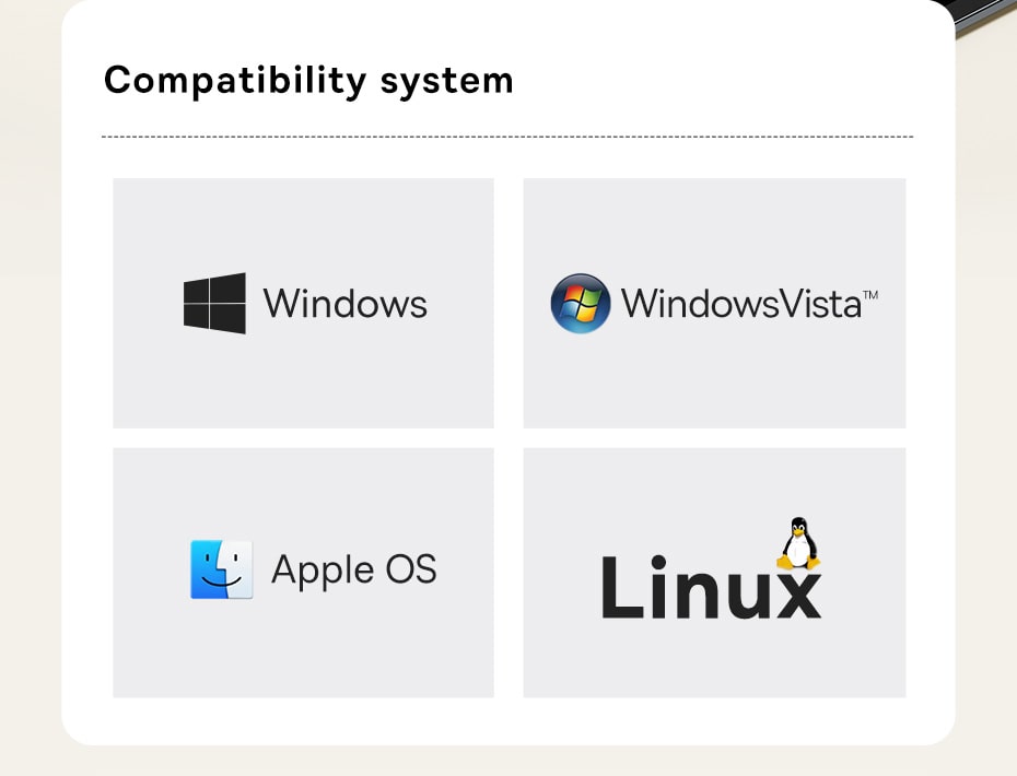 | Hệ điều hành tương thích | Windows, AppleOS, Linux, Vista |