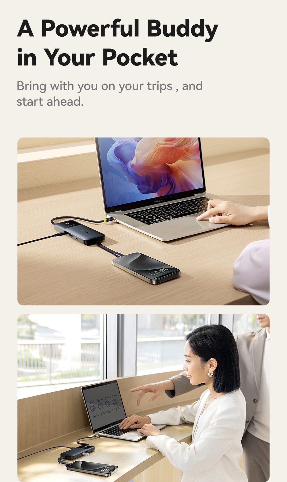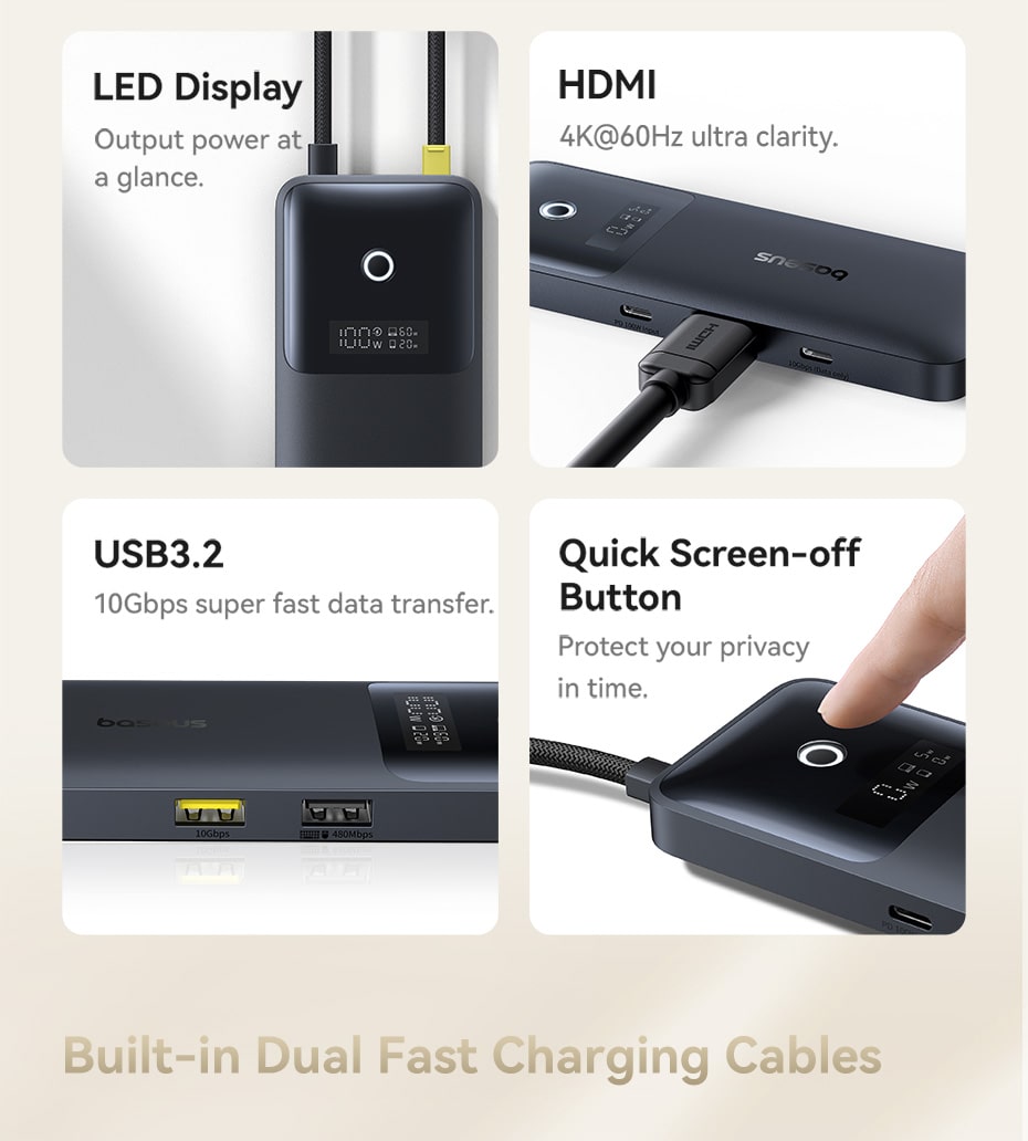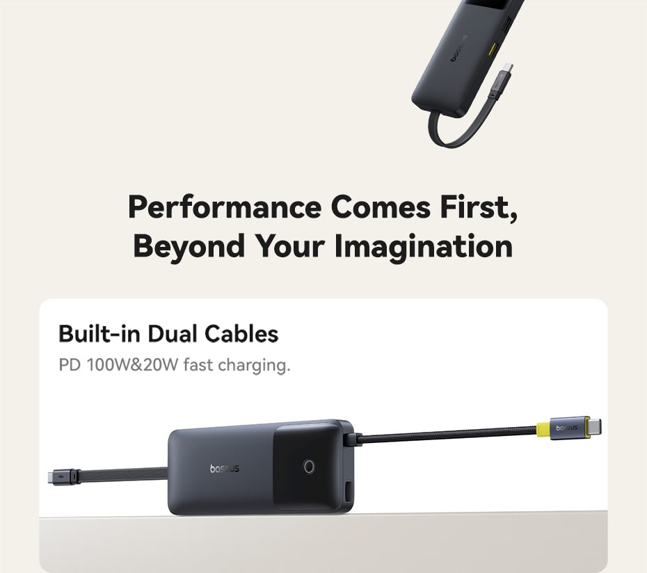 🔗 Thiết Kế 2 Dây Cáp Tích Hợp Độc Đáo: Đây là điểm khác biệt nhất! Hub được trang bị sẵn 2 dây cáp sạc nhanh, cho phép bạn kết nối và sạc đồng thời cho cả laptop và điện thoại mà không cần thêm bất kỳ sợi cáp nào khác, cực kỳ gọn gàng và tiện lợi.