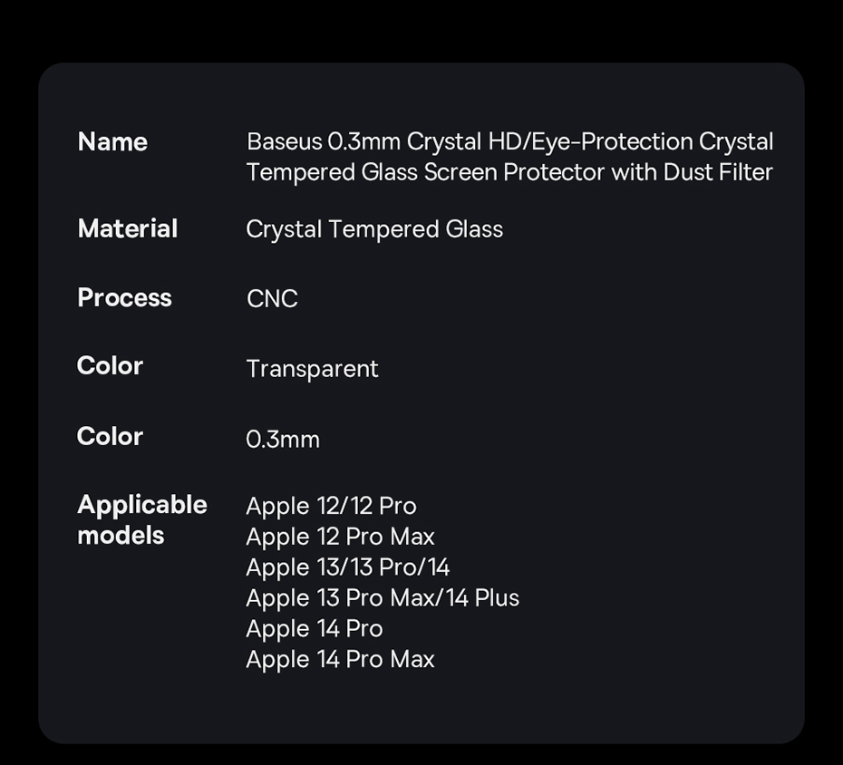 | Tên | Kính Cường Lực Bảo Vệ Mắt Baseus 0.3mm Eye-Protection Crystal Tempered Glass Screen Protector with Dust Filter for iP 12 (Bộ 1 cái) |