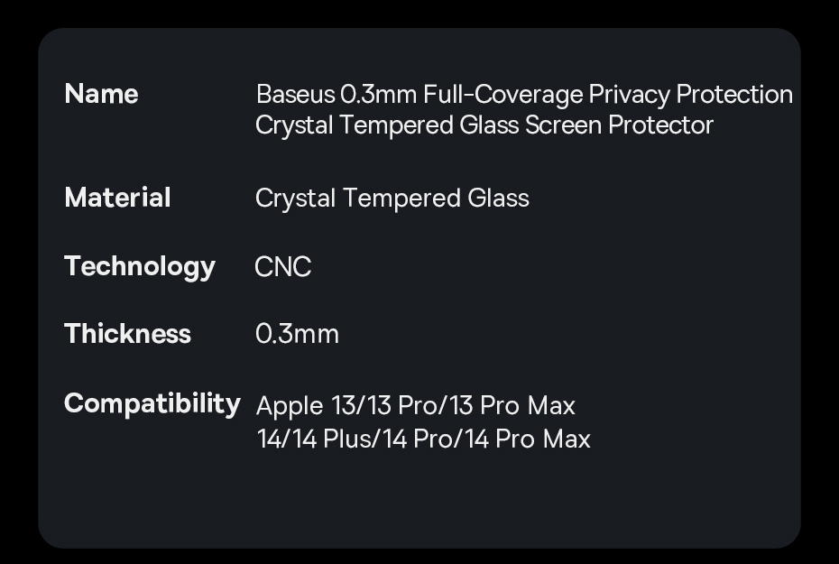 | Tên | Kính cường lực Baseus 0.3mm Full-Coverage Privacy Protection Crystal Tempered Glass Screen Protector with Built-in Dust Filter for iP 13/14 |