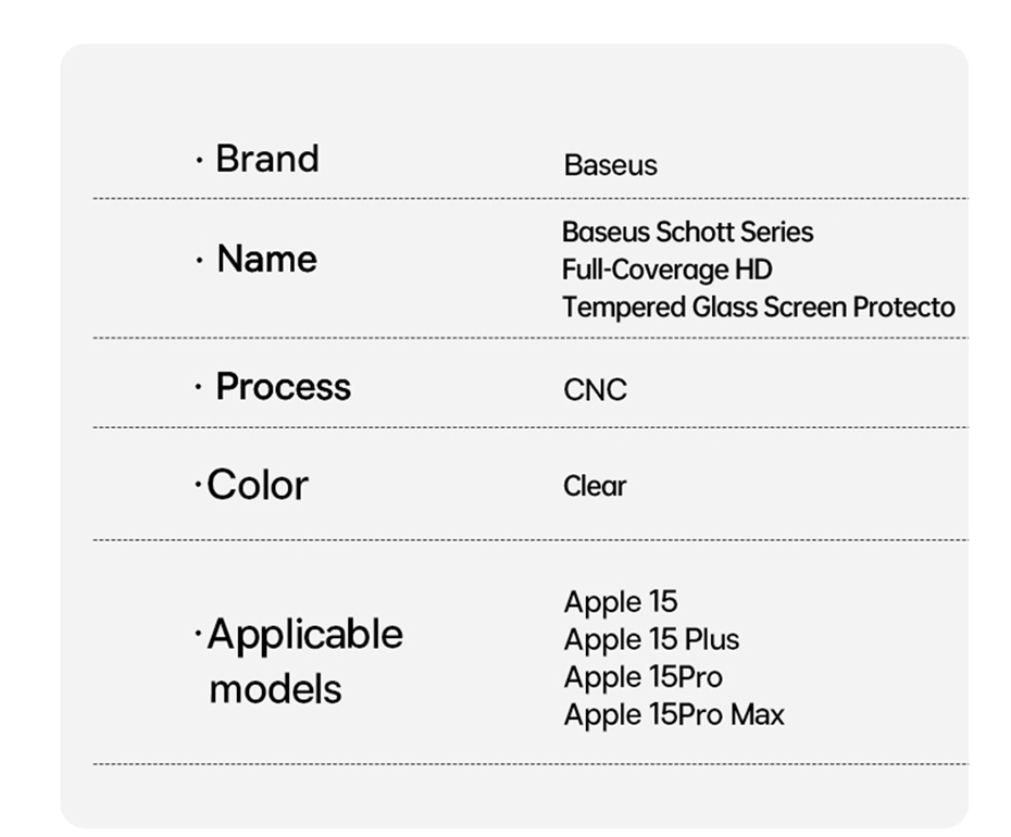 | Tên | Kính Cường Lực Chống Nhìn Trộm Baseus Schott Series Full-Coverage Privacy Protection Tempered Glass Screen Protector with Built-in Dust Filter for iP 15 |