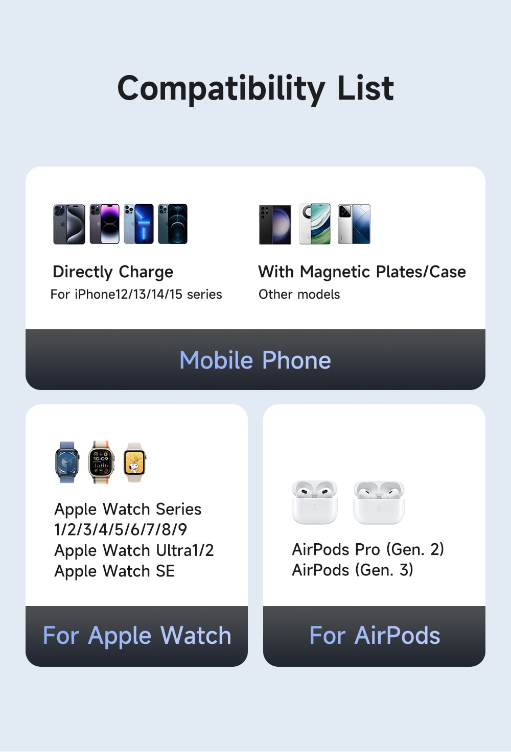📱+⌚️ Sạc Đồng Thời Điện Thoại & AppleWatch: Thiết kế thông minh cho phép bạn sạc cùng lúc cả điện thoại (qua đế hít nam châm) và AppleWatch (qua đế sạc từ tính). Dọn dẹp không gian của bạn chỉ với một thiết bị duy nhất, không cần nhiều dây cáp.