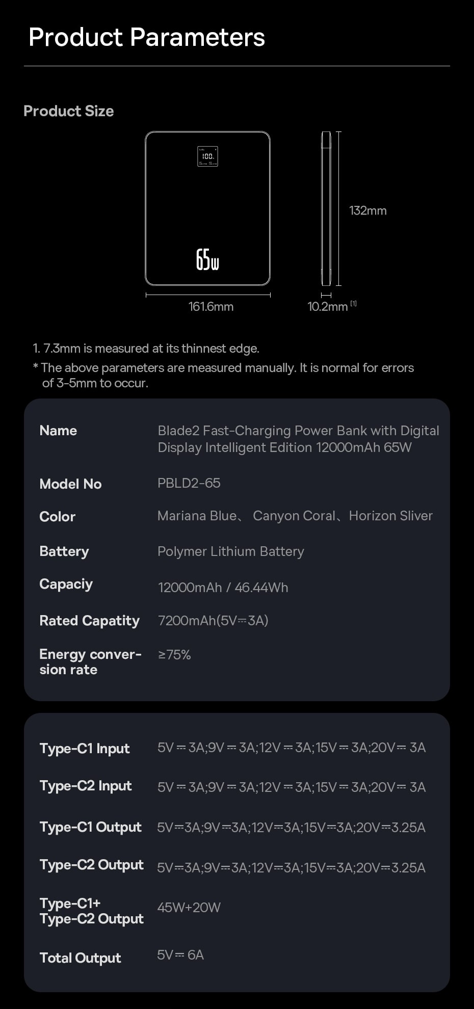 | Type-C2 Output | 5V-3A, 9V-3A, 12V-3A, 15V-3A, 20V-3.25A |