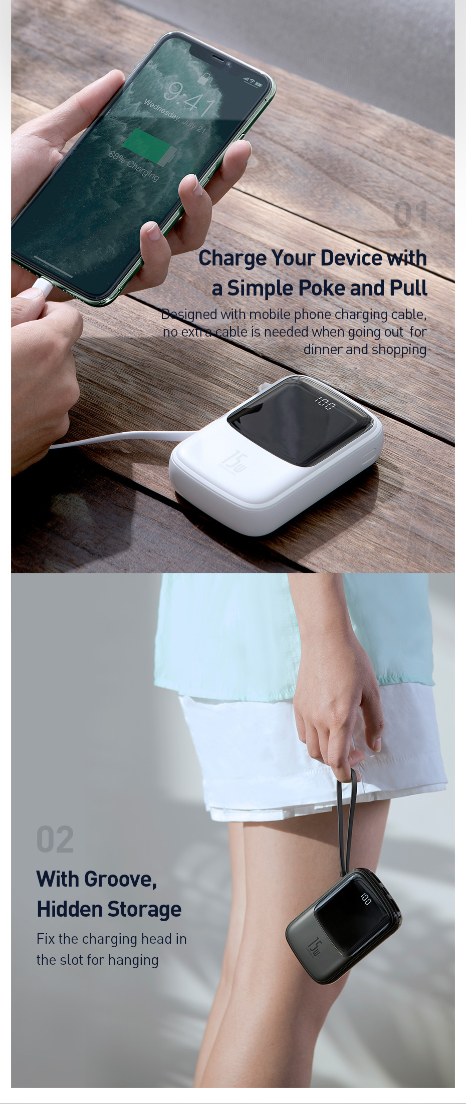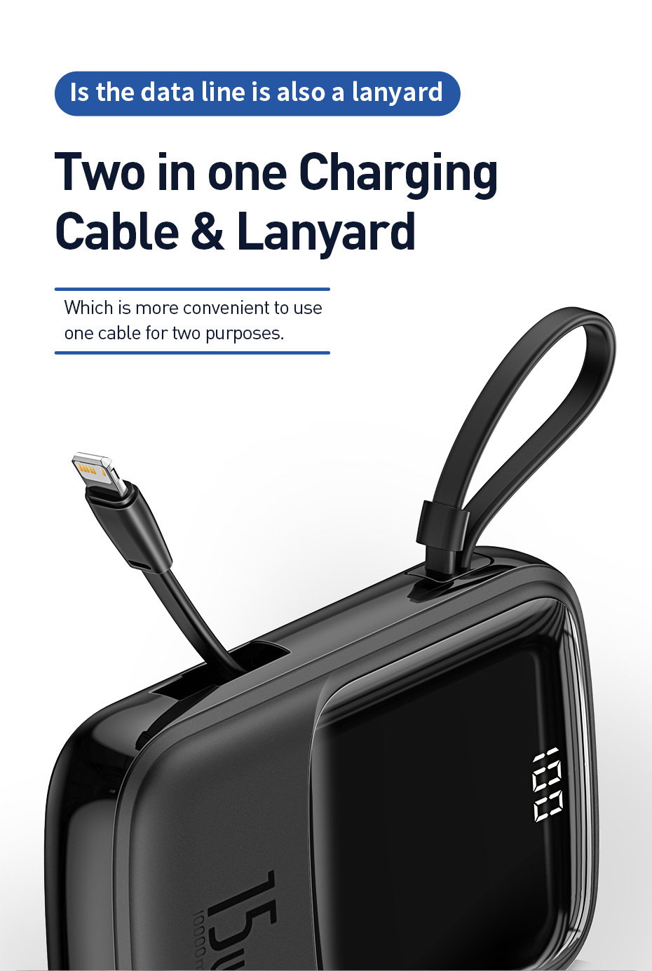 🎒 CÁP TÍCH HỢP 2-TRONG-1 (SẠC & DÂY ĐEO): Thiết kế độc đáo với dây sạc gắn liền thân pin. Khi không dùng, nó trở thành một chiếc dây đeo tiện lợi. Bạn không cần mang thêm cáp rời rườm rà, không lo thất lạc. (Lưu ý: Vui lòng chọn đúng phân loại Cáp Ln cho máy iP hoặc Cáp Type-C cho máy Android/iP15)