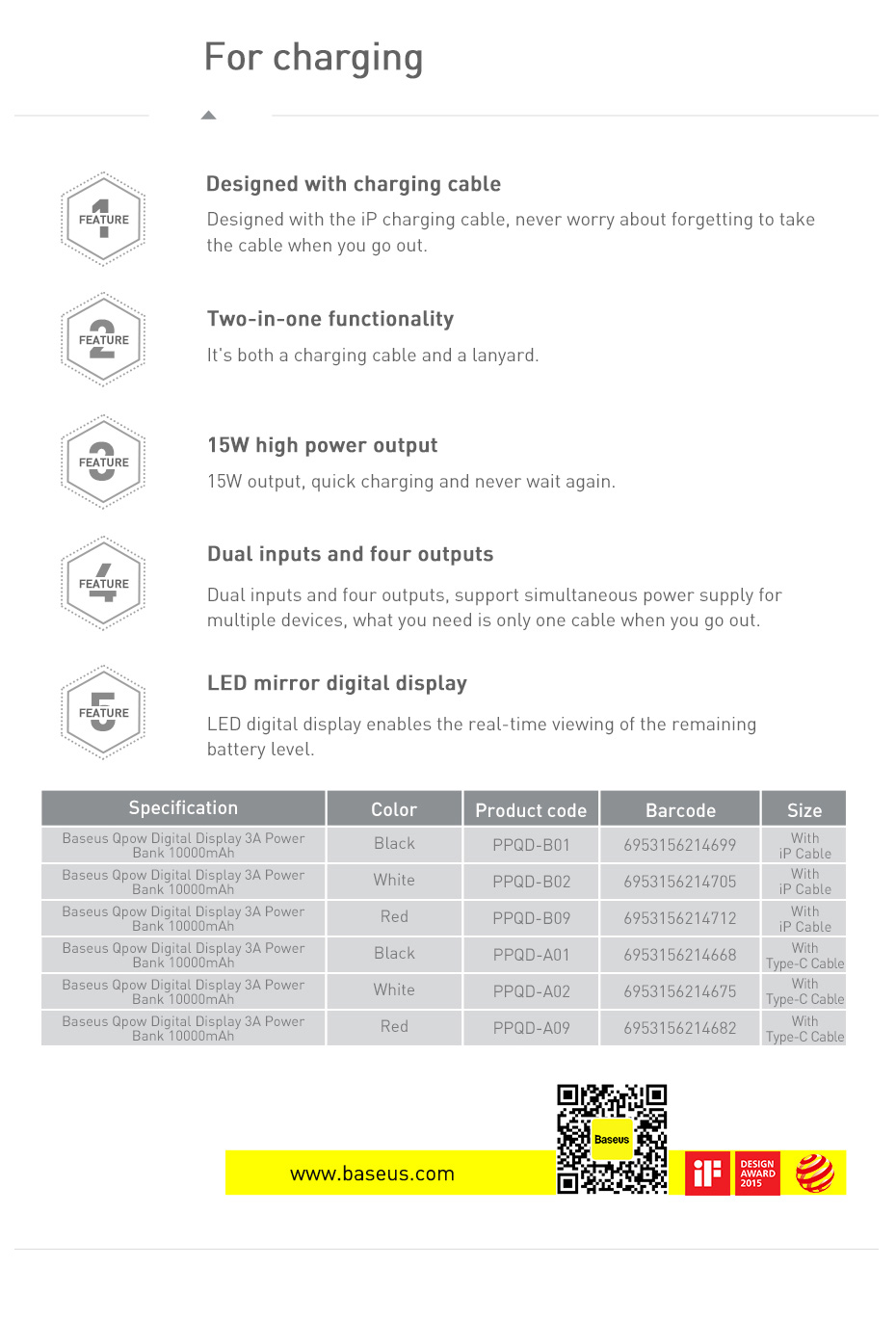 Pin dự phòng tích hợp cáp sạc Baseus Q Pow Digital Display 10,000mAh (3A/ 15W, Fast Charge Power Bank With Cable Type C)