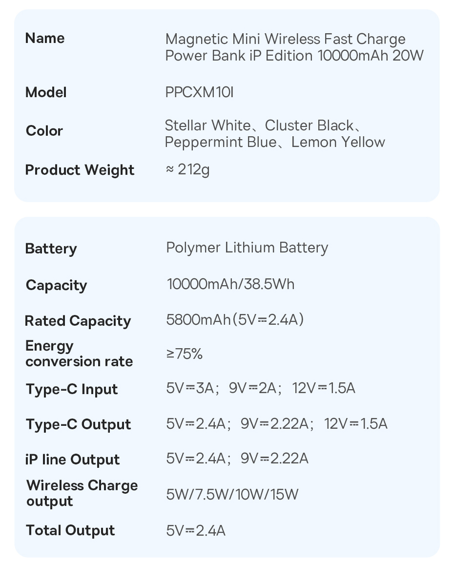 | Type-C Output | Type-C Version: 5V-3A, 9V-3A, 12V-2.5A, 15V-2A iP Version: 5V-2.4A, 9V-2.22A, 12V-1.5A |