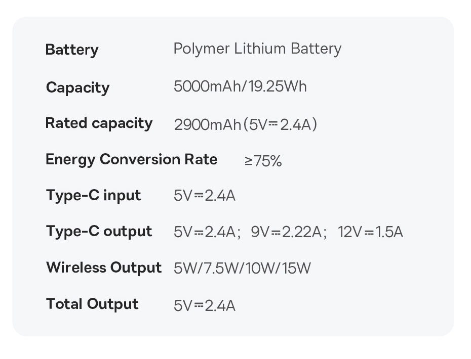 | Type-C Output | 5V-2.4A, 9V-2.22A, 12V-1.5A |