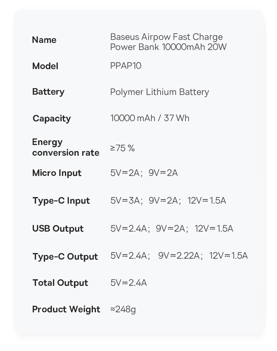 | Tên | Sạc Dự Phòng OS-Baseus Airpow Fast Charge Power Bank 10000mAh 20W (Kèm cáp USB to C, 30cm) |