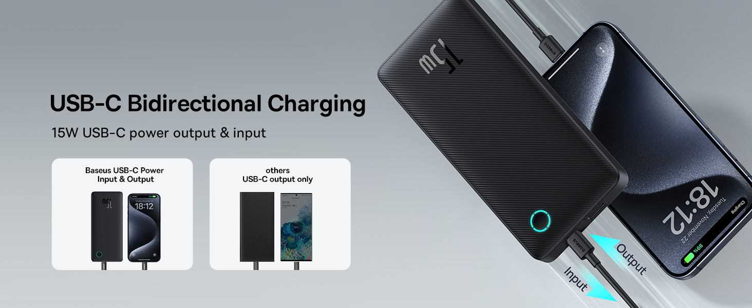 ↔️ Sạc Nhanh 2 Chiều 15W Tiện Lợi: Cổng Type-C hỗ trợ sạc nhanh 2 chiều. Bạn không chỉ sạc nhanh 15W cho các thiết bị mà còn có thể nạp đầy lại cho chính viên pin dự phòng trong thời gian ngắn nhất. Một cổng duy nhất cho cả hai chiều sạc cực kỳ tiện lợi.