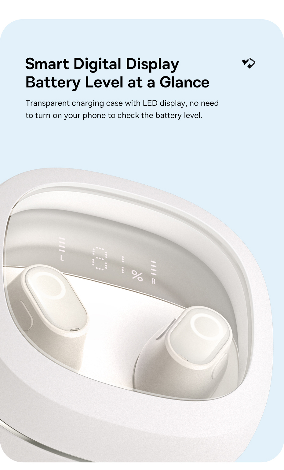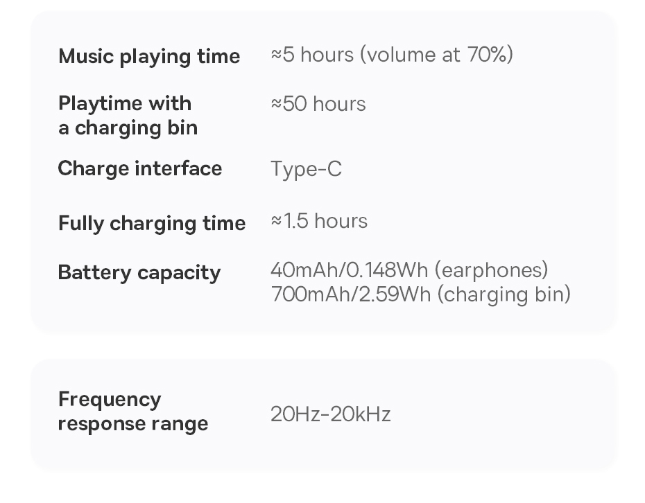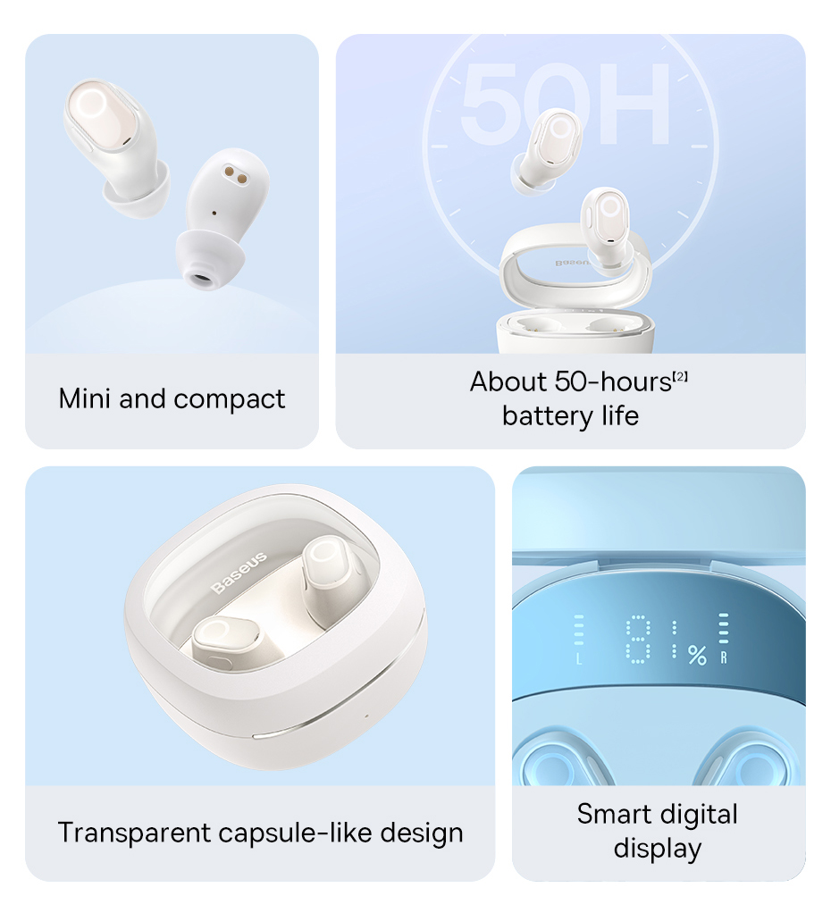- Thiết kế in-ear nhỏ gọn, thoải mái khi đeo lâu, kèm hộp sạc trong suốt thời trang và tiện lợi.