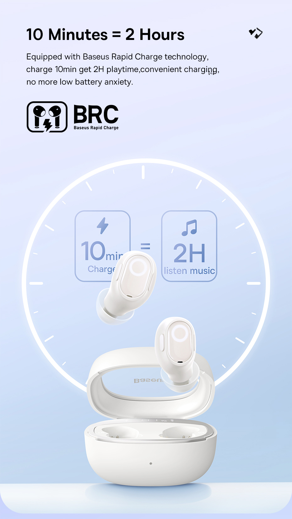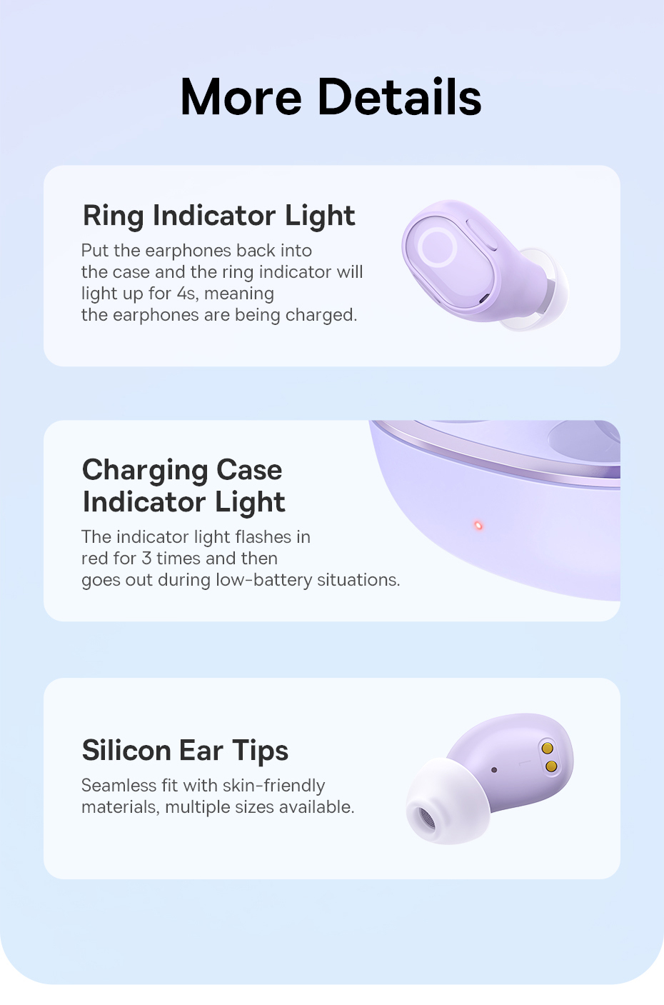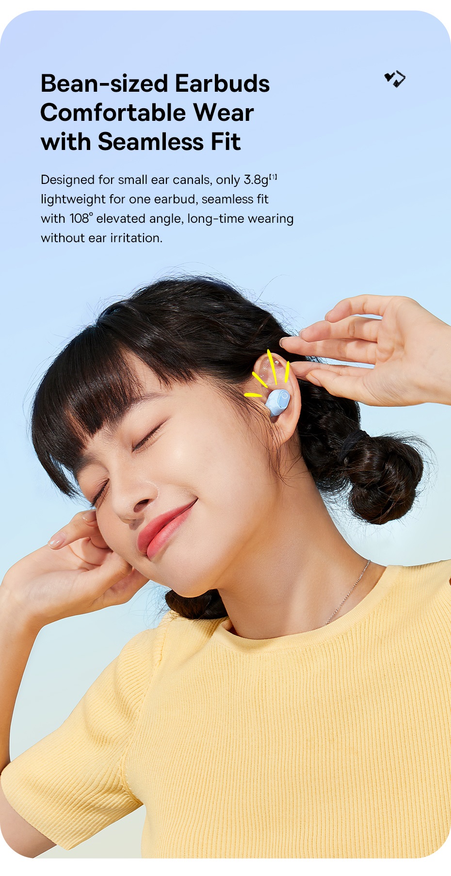- Thiết kế in-ear nhỏ gọn, thoải mái khi đeo lâu, kèm hộp sạc trong suốt thời trang và tiện lợi.