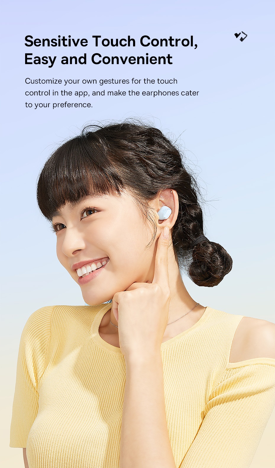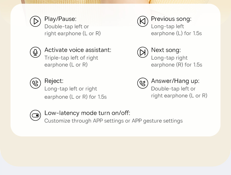 - Điều khiển cảm ứng trên tai nghe cho phép thao tác nhanh chóng như phát/dừng nhạc, chuyển bài, nhận cuộc gọi.