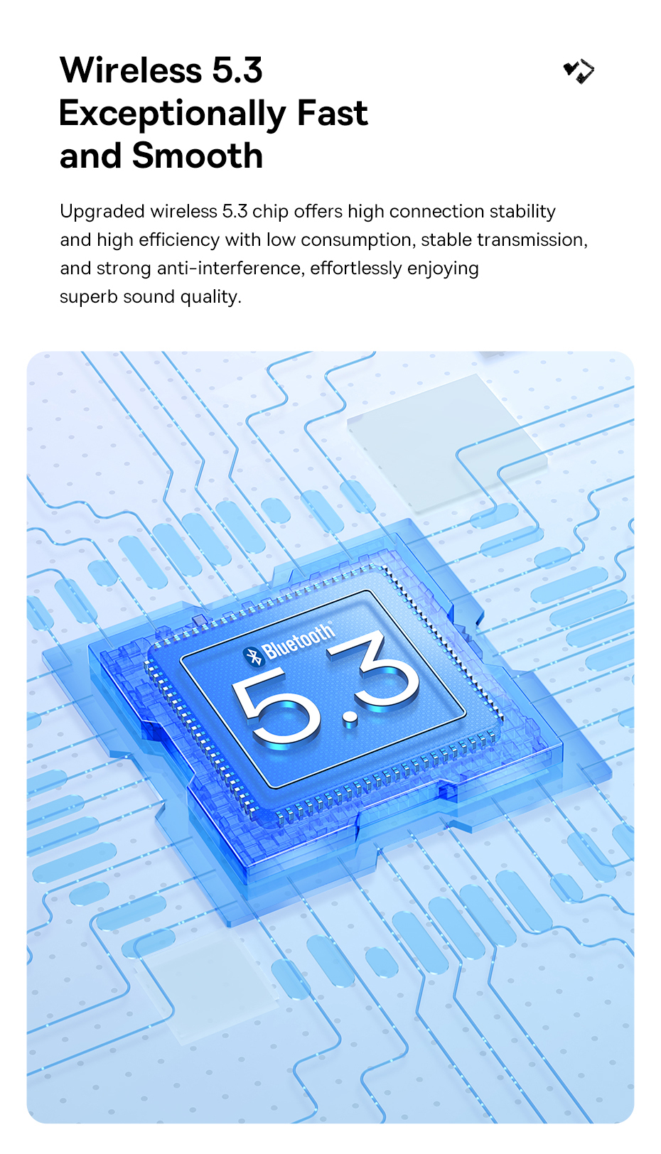 - Kết nối Bluetooth 5.3 cho tín hiệu ổn định, tiết kiệm pin và độ trễ cực thấp khi xem video hoặc chơi game.