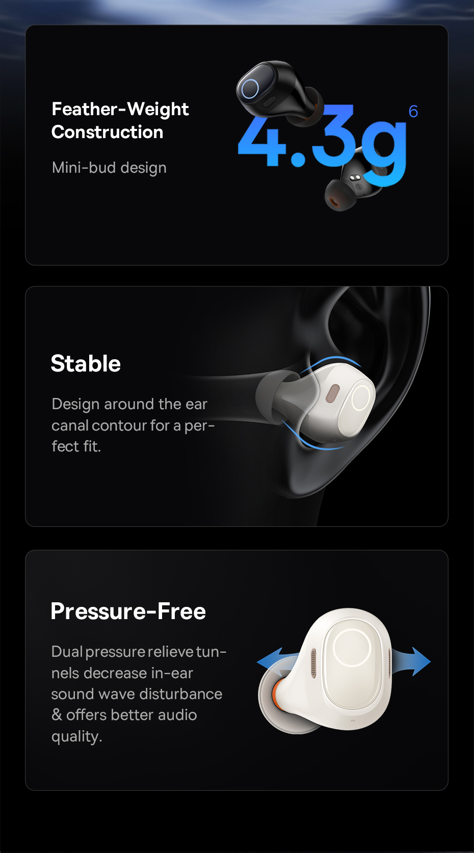 Thiết kế siêu nhẹ chỉ 4.3g: Giúp bạn đeo thoải mái trong thời gian dài mà không bị đau tai.
