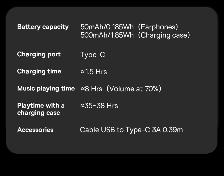 Tổng thời lượng pin cực khủng, lên đến 38 giờ: Hỗ trợ sạc nhanh, chỉ cần sạc 10 phút là có thể nghe được 2 giờ.