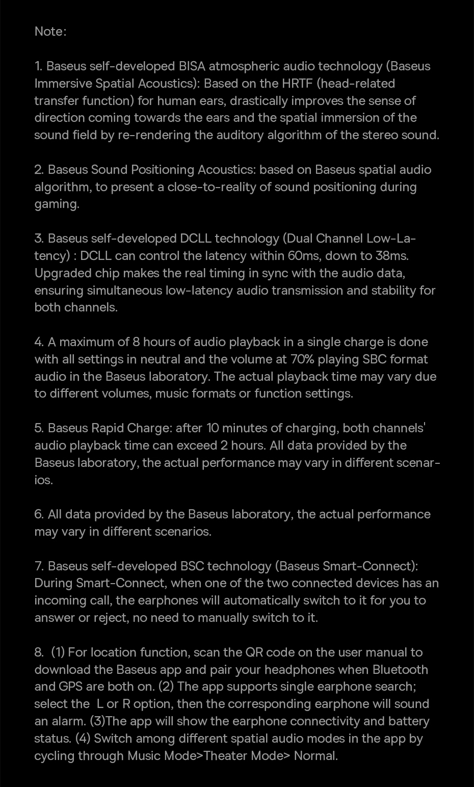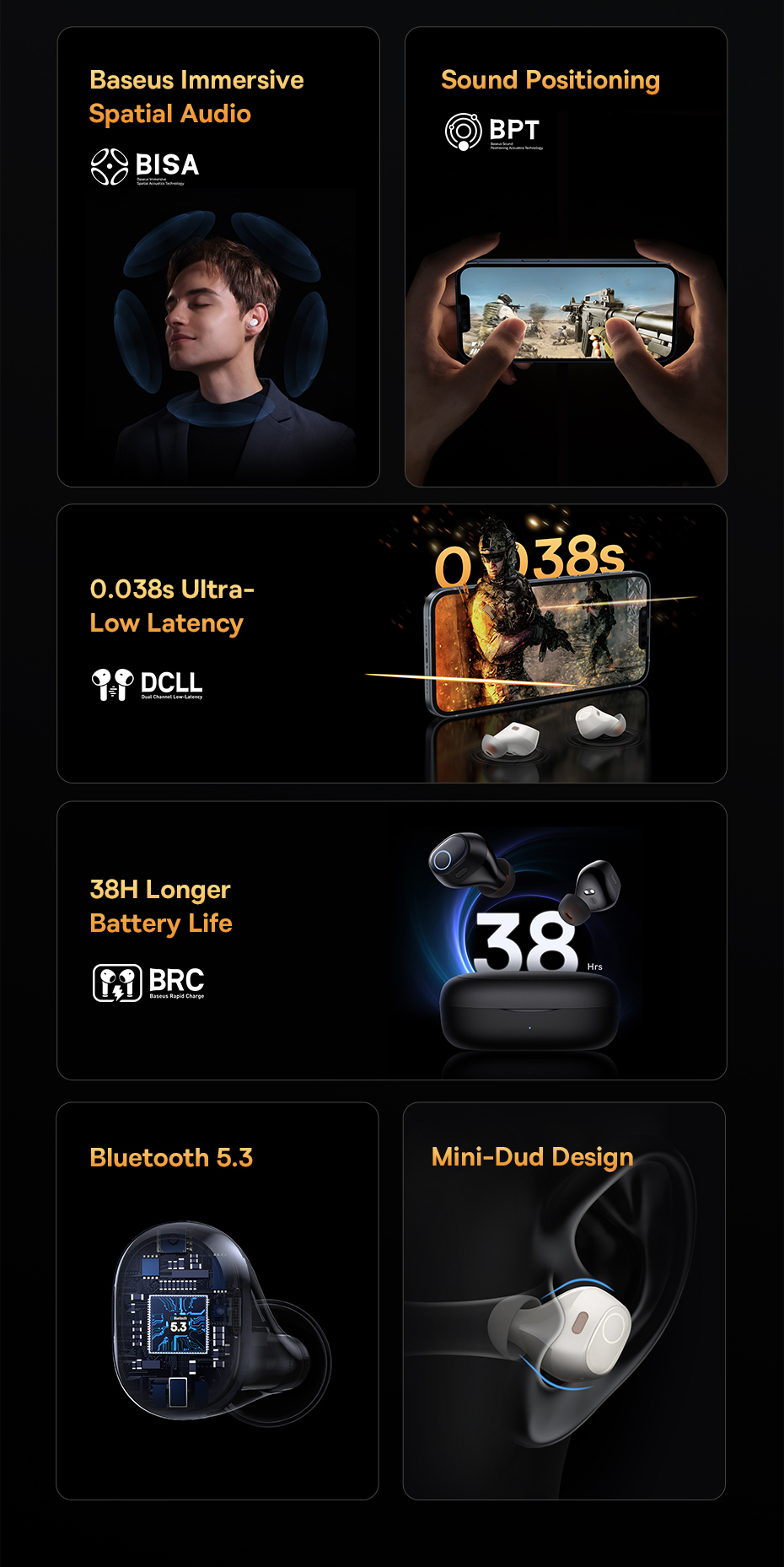 🎮 ĐỘ TRỄ SIÊU THẤP 0.038S & ĐỊNH VỊ ÂM THANH: Nghe là thấy, phản ứng tức thì! Kích hoạt chế độ gaming để giảm độ trễ xuống chỉ còn 0.038s, đồng bộ hóa hoàn hảo âm thanh và hình ảnh. Công nghệ định vị âm thanh độc quyền của Baseus giúp bạn xác định chính xác vị trí của đối thủ qua tiếng bước chân, tiếng súng, mang lại lợi thế chiến thuật vượt trội.