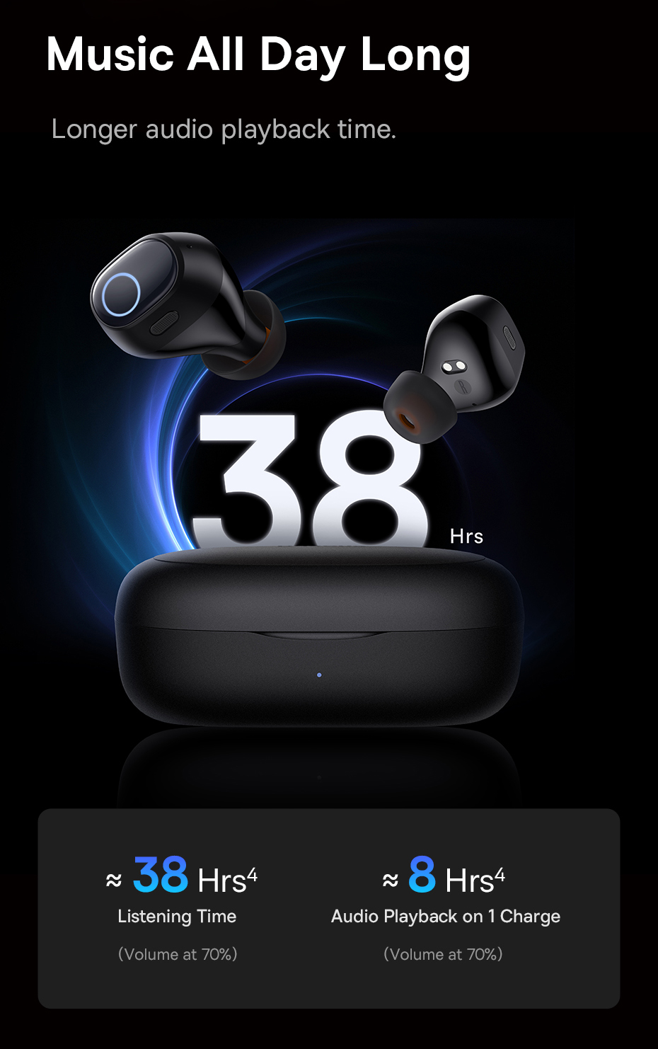 🔋 PIN KHỦNG 38 GIỜ & SẠC SIÊU NHANH: Chơi game, nghe nhạc cả ngày không lo hết pin. Tai nghe cho đến 8 giờ sử dụng liên tục chỉ với một lần sạc, và hộp sạc cung cấp tổng thời lượng pin lên đến 38 giờ. Hết pin? Đừng lo, chỉ cần sạc 10 phút là bạn đã có ngay 2 giờ sử dụng.