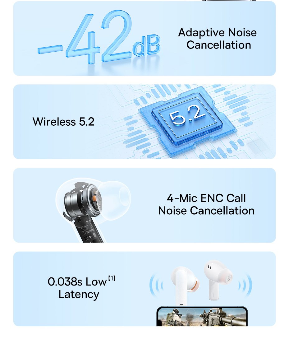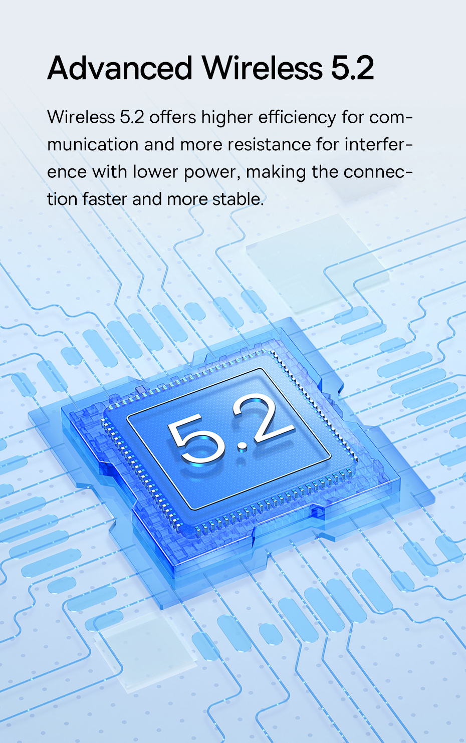 Bluetooth 5.2 & Độ trễ thấp 0.038s: Kết nối ổn định, chơi game và xem phim mượt mà.