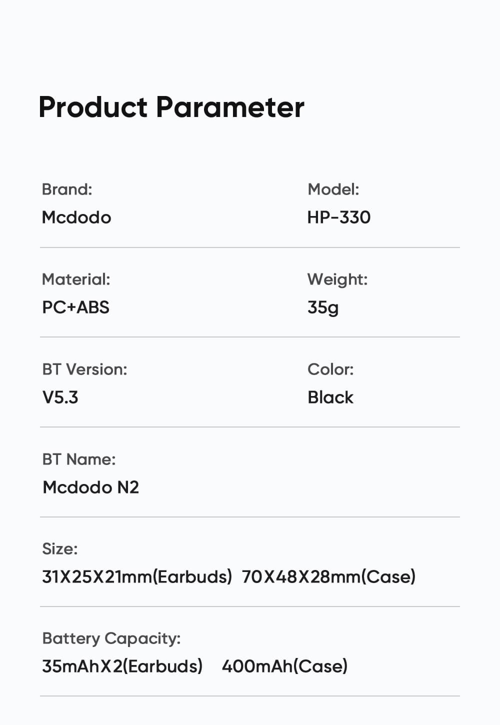 | Tên | Tai Nghe bluetooth Mcdodo N2 Series ANC+ENC in-ear digital display TWS ears |