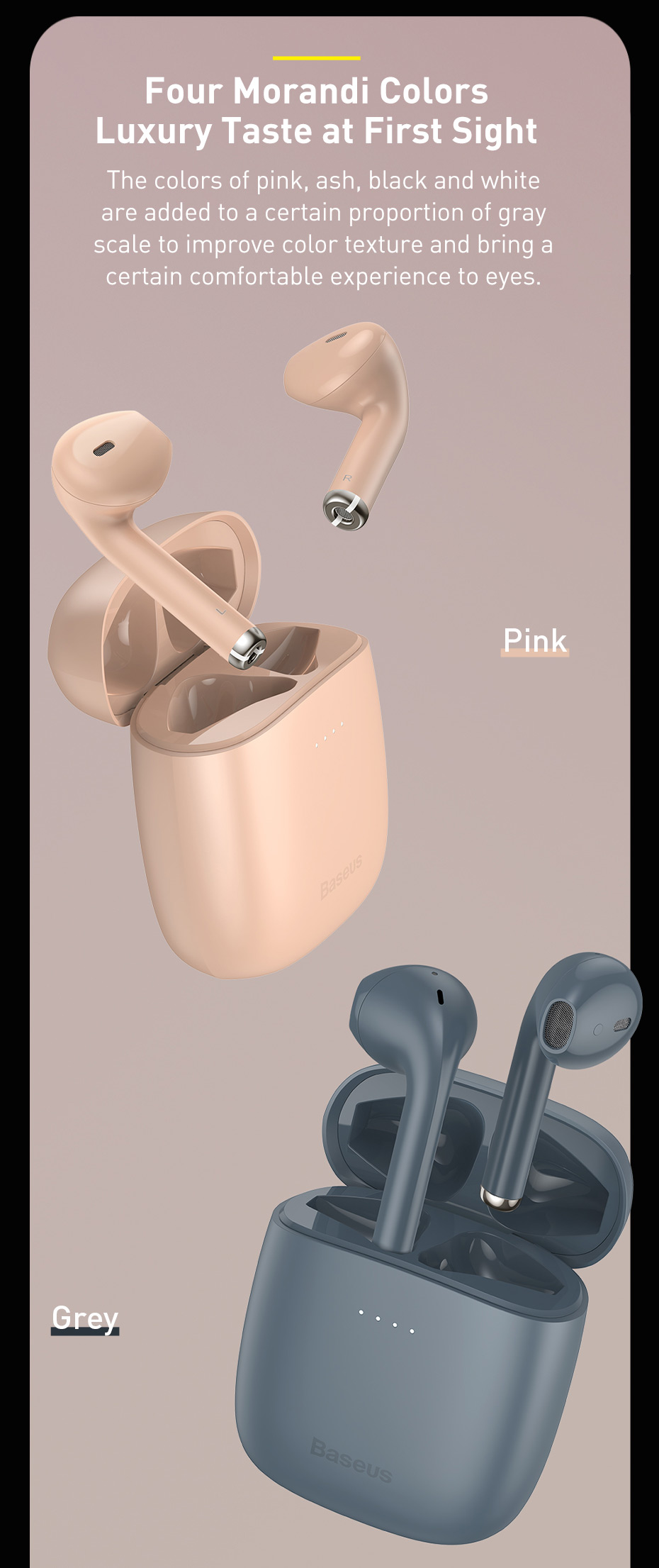 Thiết kế nhỏ gọn , sang trọng và đẳng cấp, chất lượng âm thanh trung thực, sống động , không thua kèm bất kỳ tai nghe nào đi cùng với những tính năng tiện ích độc đáo và khả năng sạc không dây (W04 pro) . Tai nghe Baseus Encok W04 Series thật sự là một chiếc tai nghe đáng để sở hữu dành riêng cho những tín đồ tai nghe True Wireless.