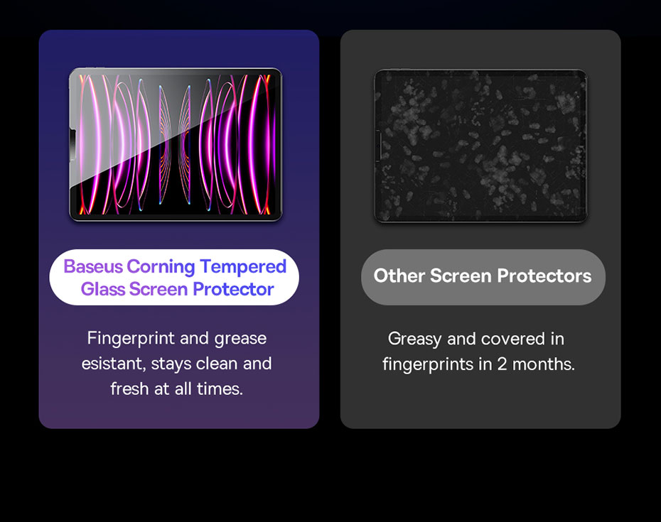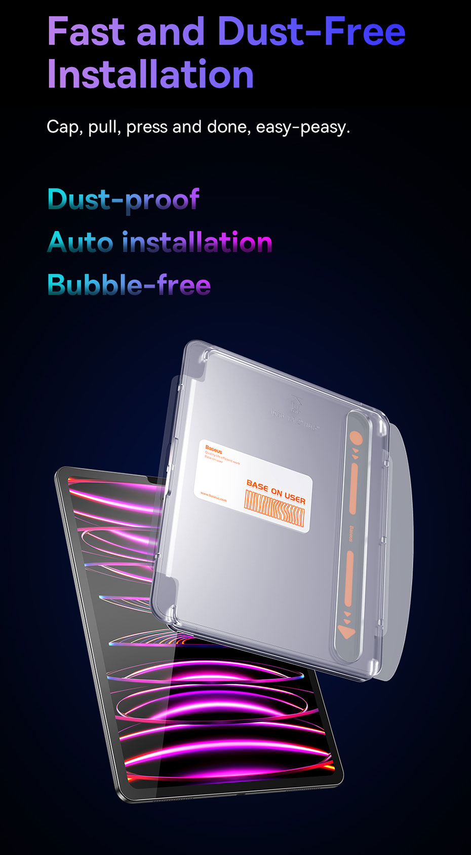 Trang bị lớp bảo vệ tối thượng cho màn hình máy tính bảng của bạn với Kính cường lực Corning từ Baseus. Sử dụng chất liệu kính cao cấp, kết hợp cùng bộ dụng cụ tự dán chống bụi thông minh, bạn có thể dễ dàng có được một lớp bảo vệ hoàn hảo, không tì vết ngay tại nhà.