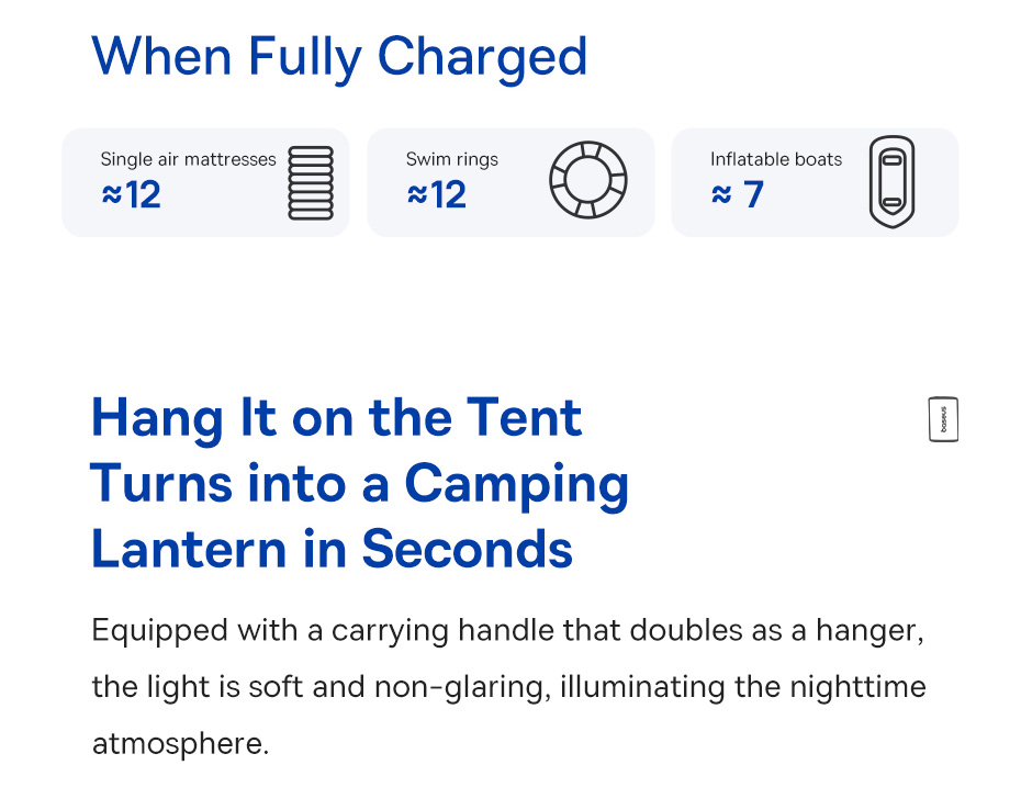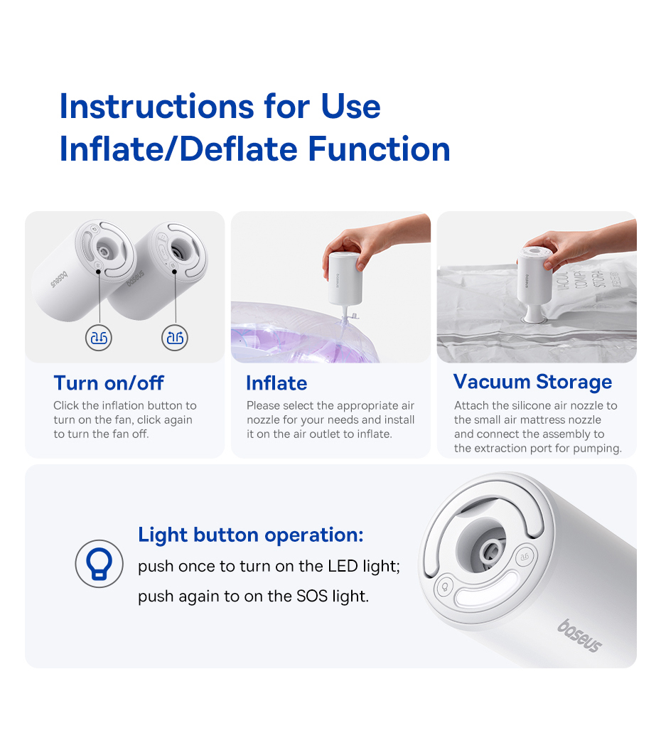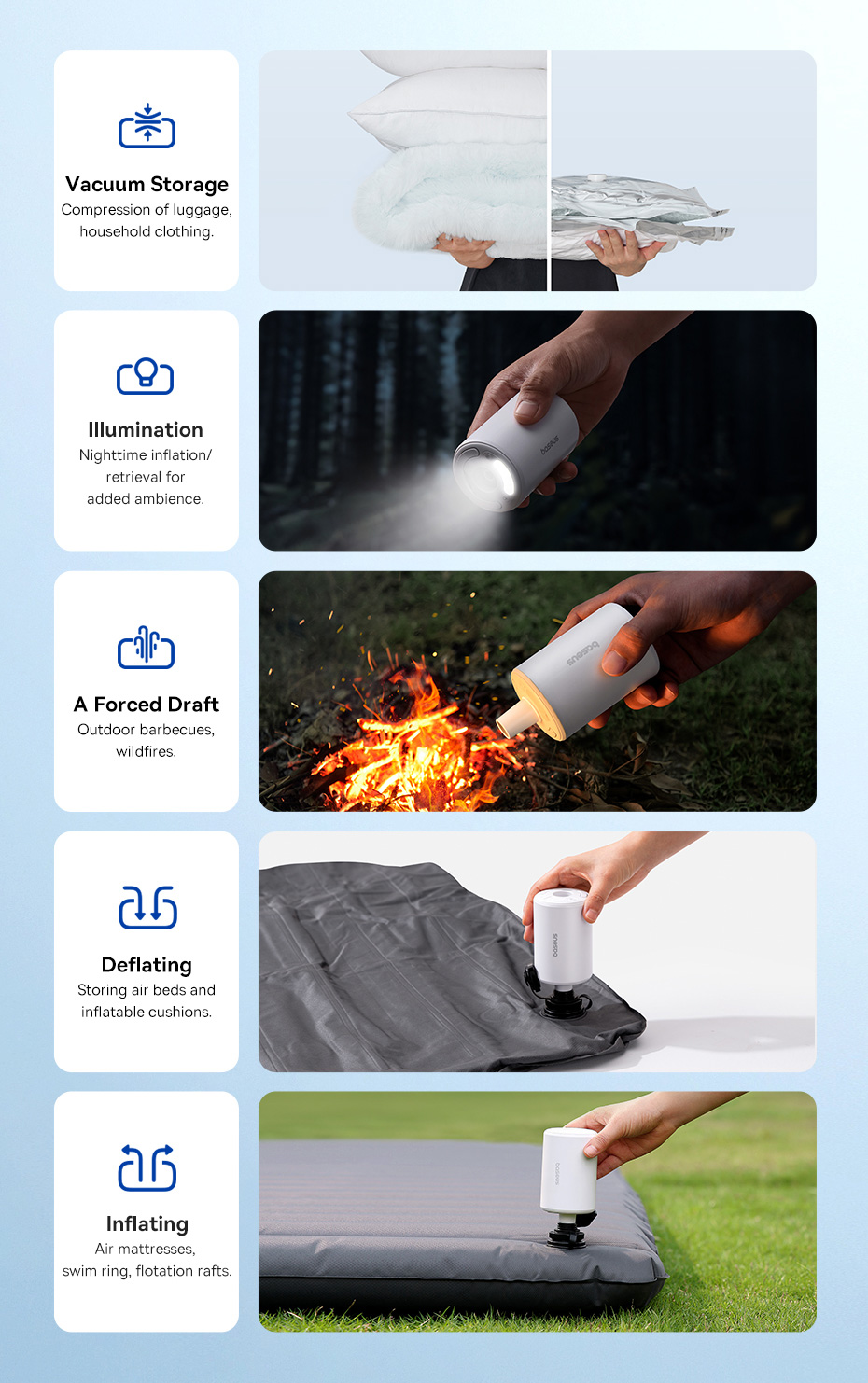 ○ Thiết kế đa năng: Bơm hơi, hút chân không và đèn chiếu sáng.